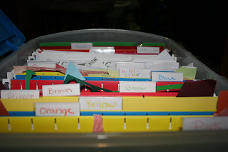 I purchased a few file folders, and a file tote. I have everything organized by color. For the hard to categorize, I have a 'multi color' folder.